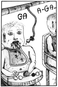 Pour reconstituer rapidement les stocks humains et développer la race pure, le G.G.R. mit en place une banque de spermes et d’ovules. En plus de leur devoir conjugal obligatoire, les R. et B. devaient périodiquement faire don de leurs gamètes. Cette banque alimentait une usine automatisée qui produisait des foetus en série dans des cultures de tissus vivants baignant dans le sang extrait de la pluie. Suivait une couveuse accélérée qui permettait environ 3000 naissances tous les 4 mois. Ce sont les scientifiques envoyés par le gouvernement qui installèrent ce complexe de natalité. Il y eut du rebut, surtout au début, mais l’ensemble fonctionna plutôt bien.