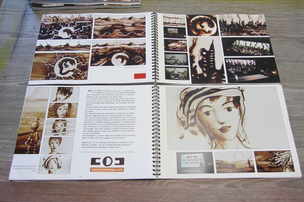 L’impression sur papier permet de voir autrement les images et d’en avoir une trace durable et matérielle. Leur mise en relation dans les pages évoque le mouvement des films ou des spectacles.